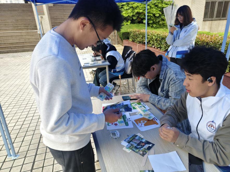 活动现场氛围热烈,三大特色环节将环保教育从“说教”变为“体验”,让绿色理念在师生沉浸式参与中入脑入心。“给地球写句话”环节温情满满,同学们纷纷提笔写下环保寄语,一张张写满环保心愿的便利贴,化作细雨中最动人的风景。“垃圾分类翻翻乐”环节寓教于乐,同学们通过卡片配对游戏在趣味比拼中学习垃圾分类知识,让科普知识入脑入心。“环保行动抽抽乐”环节则生动诠释了“微行动汇聚大改变”的环保理念。同学们抽取“节水节电”等简易环保任务,完成实践后即可兑换种子纸,将绿色承诺与希望一同种下,让环保信念生根发芽。活动还融入趣味“运势签”,在欢声笑语中传递绿色生活小知识,让低碳微行动深入人心。