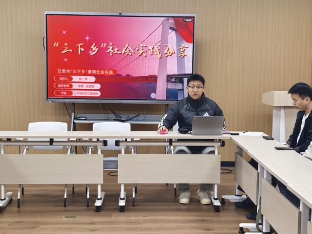 2025年11月27日下午,由土木与水利工程学院举办的“三下乡”社会实践分享活动在屯溪路校区纬地楼401室举行。活动以“行走红色热土,争做强国栋梁”为主题,邀请杨一博同学作专题报告,近30名硕士研究生参加。